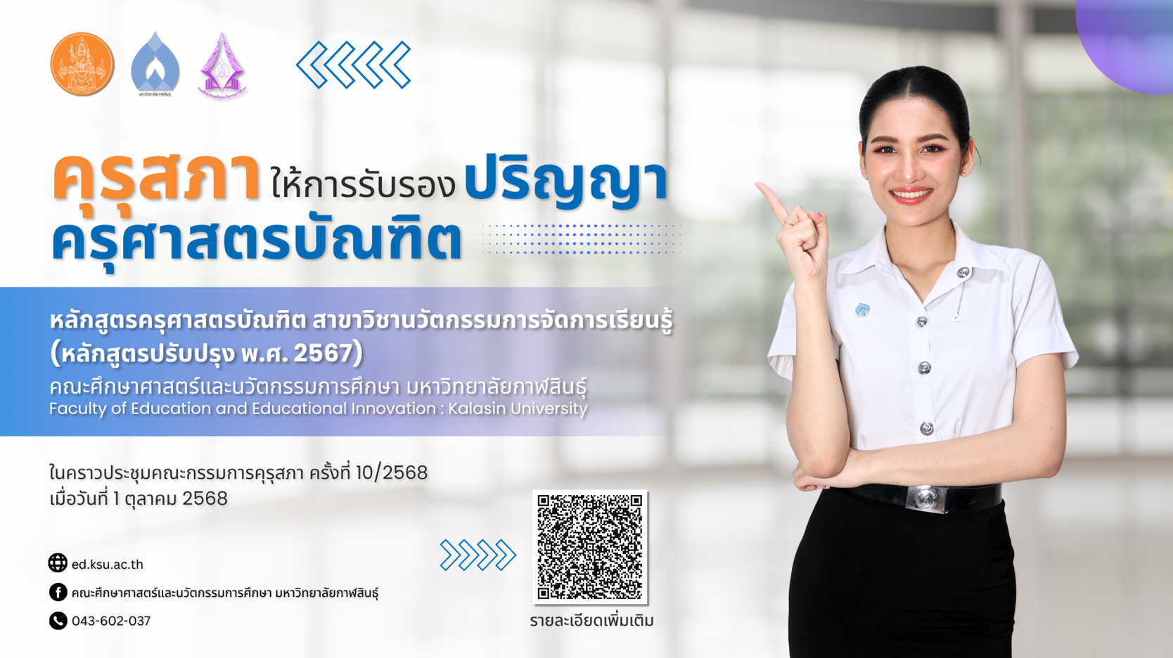 คุรุสภาให้การรับรองปริญญาครุศาสตรบัณฑิต หลักสูตรครุศาสตรบัณฑิต สาขาวิชานวัตกรรมการจัดการเรียนรู้ (หลักสูตรปรับปรุง พ.ศ. 2567) คณะศึกษาศาสตร์และนวัตกรรมการศึกษา มหาวิทยาลัยกาฬสินธุ์ ทั้ง 12 วิชาเอก