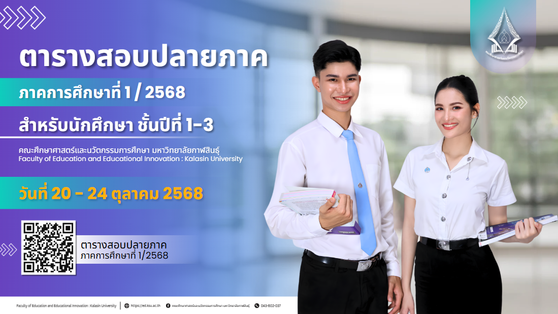 ตารางสอบปลายภาค ภาคการศึกษาที่ 1 ปีการศึกษา 2568 สำหรับนักศึกษา ชั้นปีที่ 1-3 คณะศึกษาศาสตร์และนวัตกรรมการศึกษา มหาวิทยาลัยกาฬสินธุ์ วันที่ 20 - 24 ตุลาคม 2568