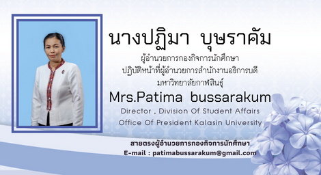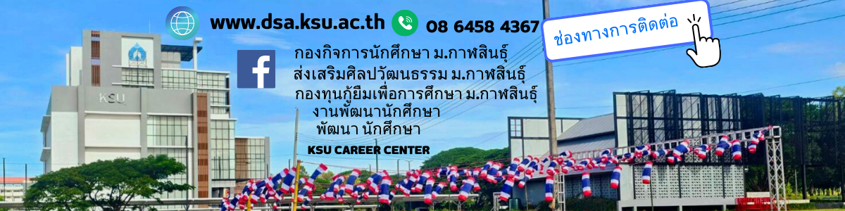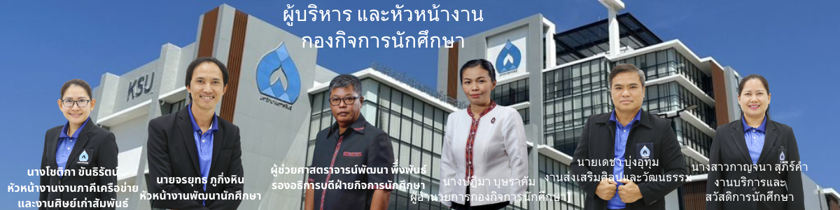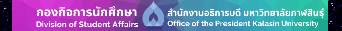 กองกิจการนักศึกษา สำนักงานอธิการบดี มหาวิทยาลัยกาฬสินธุ์ พื้นที่ในเมือง อาคารสำนักงานอธิการบดีและบริหารสินทรัพย์ ชั้น 1 เลขที่ 62/1 ถ.เกษตรสมบูรณ์ ต.กาฬสินธุ์ อ.เมือง จ.กาฬสินธุ์ 46000 / พื้นที่นามน อาคารกิจการนักศึกษา เลขที่ 13 หมู่ที่ 14 ต.สงเปลือย อ.นามน จ.กาฬสินธุ์ 46230 สงวนลิขสิทธิ์ © 2026 :กองกิจการนักศึกษา มหาวิทยาลัยกาฬสินธุ์ |