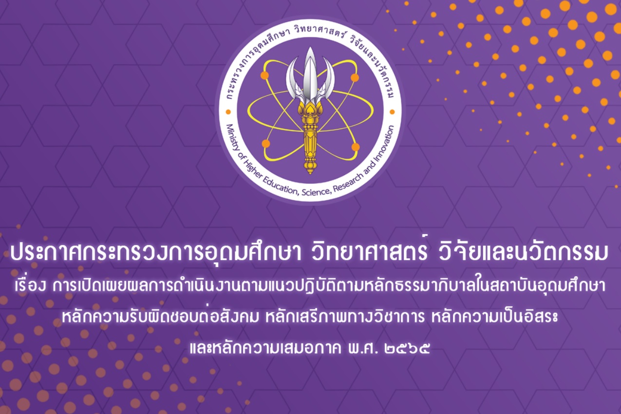 ประกาศกระทรวงการอุดมศึกษา วิทยาศาสตร์ วิจัยและนวัตกรรม เรื่อง การเปิดเผยผลการดำเนินงานตามแนวปฏิบัติตามหลักธรรมาภิบาลในสถาบันอุดมศึกษา หลักความรับผิดชอบต่อสังคม หลักเสรีภาพทางวิชาการ หลักความเป็นอิสระและหลักความเสมอภาค พ.ศ. 2565