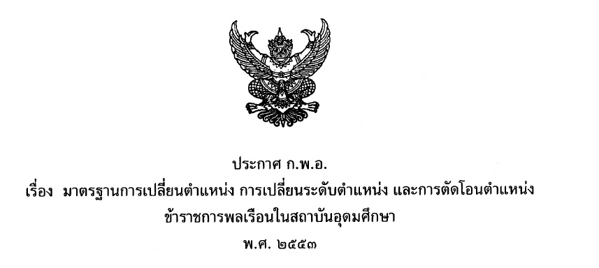 ประกาศ ก.พ.อ. เรื่อง มาตรฐานการเปลี่ยนตำแหน่ง การเปลี่ยนระดับตำแหน่ง และการตัดโอนตำแหน่ง ข้าราชการพลเรือนในสถาบันอุดมศึกษา พ.ศ. 2553