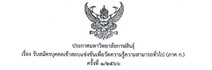 ประกาศมหาวิทยาลัยกาฬสินธุ์ เรื่อง รับสมัครบุคคลเข้าสอบแข่งขันเพื่อวัดความรู้ความสามารถทั่วไป (ภาค ก.) ครั้งที่ 1/2566