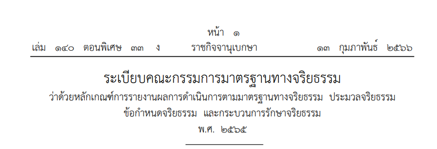 ระเบียบคณะกรรมการมาตรฐานทางจริยธรรม ว่าด้วยหลักเกณฑ์การรายงานผลการดำเนินการตามมาตรฐานทางจริยธรรม ประมวลจริยธรรม ข้อกำหนดจริยธรรม และกระบวนการรักษาจริยธรรม พ.ศ. ๒๕๖๕